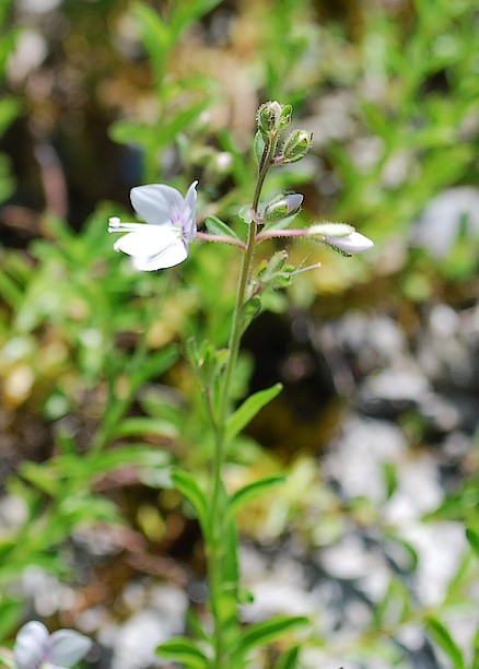 Véronique subligneuse (Veronica fruticulosa L., Plantaginacées [anc.: Scrophulariacées]). Photos prises au Jardin botanique de l'Université de Fribourg (Suisse), le 10 juin 2017. Plante mesurant 10-25 cm avec tige ligneuse à la base, bien feuillée. Feuilles petites, subsessiles, oblongues, subentières ou faiblement crénelées, glabres (atteignant 2,5 cm de long). Grappe assez compacte de fleurs avec corolle d'un rose pâle avec pétales ayant des veines pourpre-violet. Calice et pédicelle à poils glanduleux. Capsule elliptique, dépassant le calice. Fleurit de juin à juillet. Habitat: fentes de rochers, éboulis, plante calcicole. Habite la montagne de 800 à 2'700 m de haut: plante subalpine et alpine. Zones préalpines. Jura Sud (un peu). Europe centrale et méridionale. En savoir plus: voir ici, aussi ici, aussi ici, et aussi ici. Présente en Suisse.